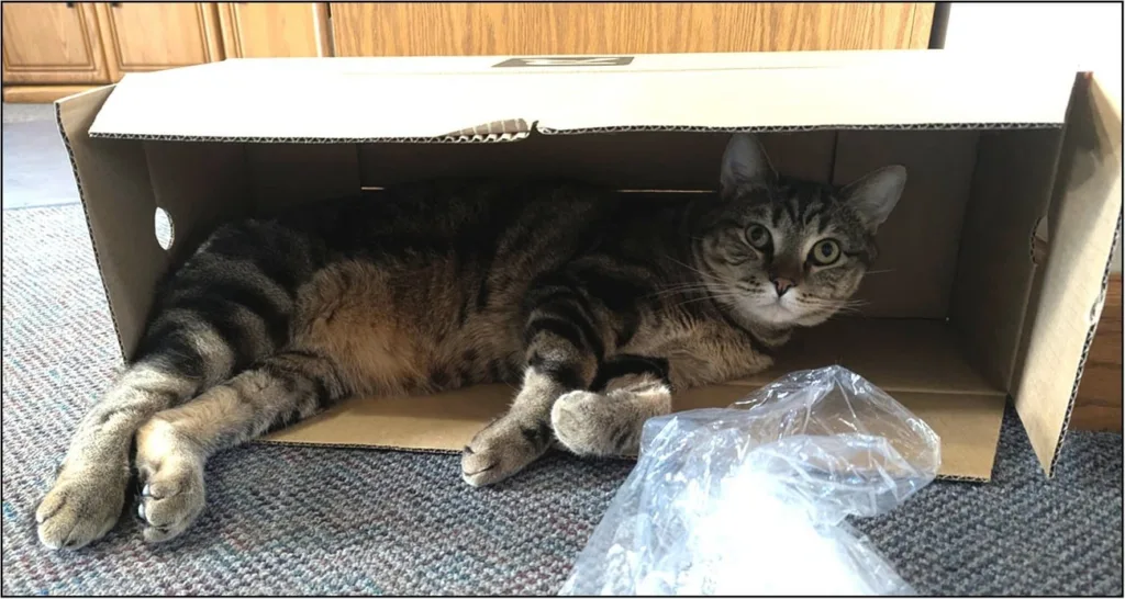 Walter the Cat spent most of yesterday in an empty cap box in Tammy’s and Kathy’s office. When Walter finds an empty cardboard box, he commandeers it as his own. He crawls inside and spends most of the day there.