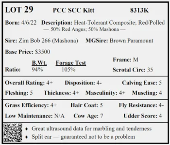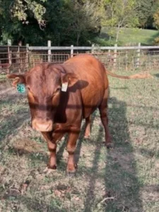 This bull has met all the stars Kit gave him in the catalog. I have been very happy with the calves I have had from him. He has not fallen off during breeding season at all. He has never attempted to rush at me anytime I go in the pasture with him. Calving ease has certainly been accurate. I have not assisted on a single birth. I sell beef at farmer’s markets and my customers have been faithful repeat buyers and tell me how much they like my beef. As a three and a half year old he should still have plenty of good breeding time left in him. Call me if you have questions.