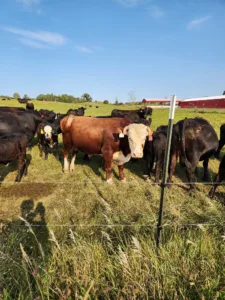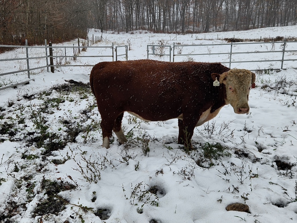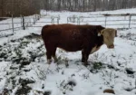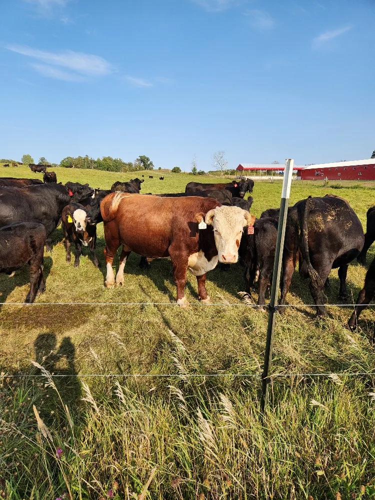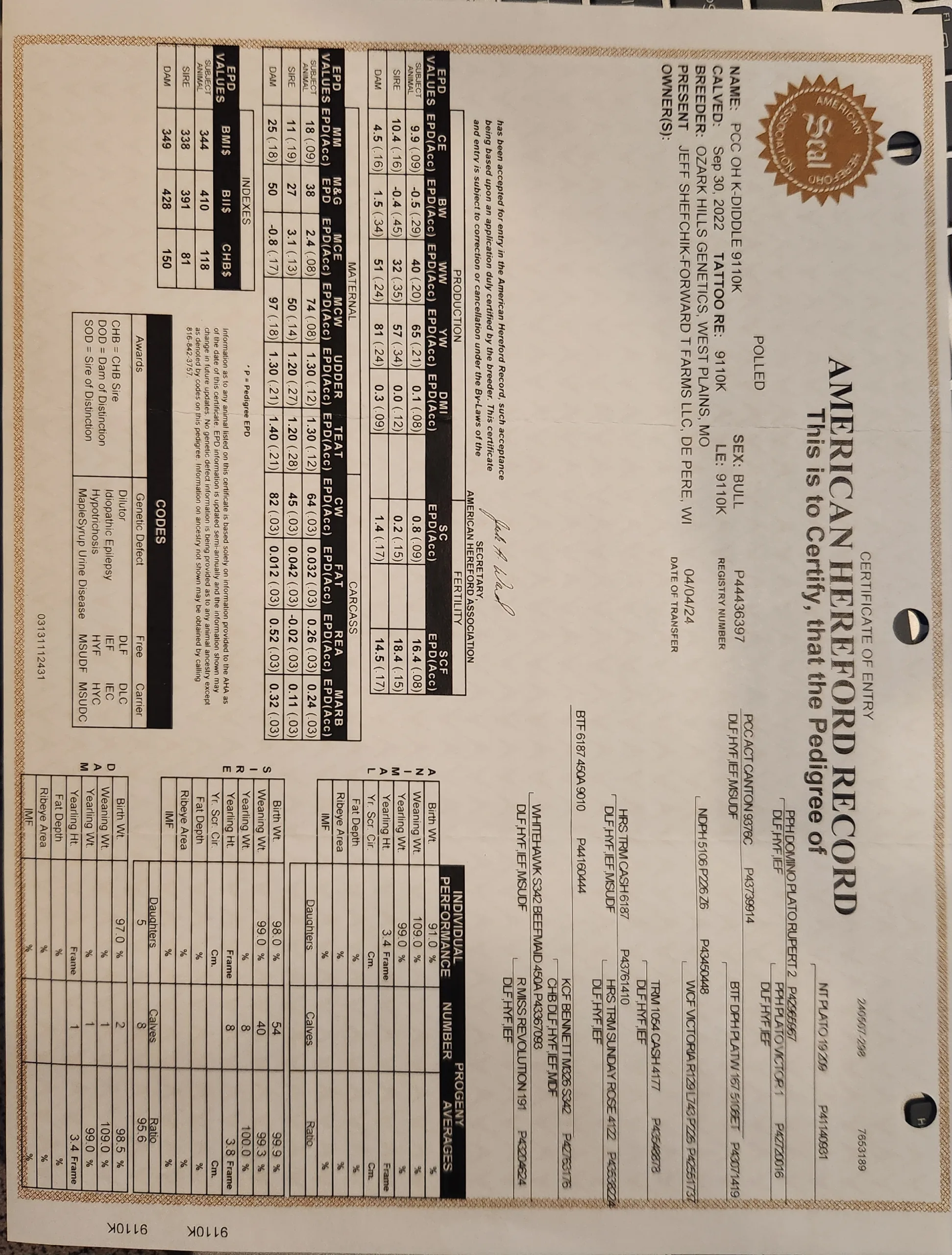 Hereford bull purchased at the PCC spring Missouri sale in 2024. He is 3.5 years old. Very gentle and has done a great job for us. Tag #9110K – Hereford reg# P44436397