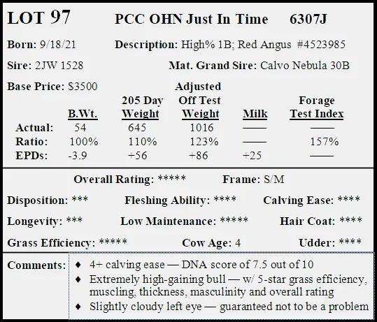 PCC OHN Just In Time 6307J. Birthdate 09-18-2021. Purchased at the 4-17-2023 MO sale. Very thick, good disposition, very easy to handle. I have bred him to first calf heifers with no problems. Text me your cell number and I will send video and photos.